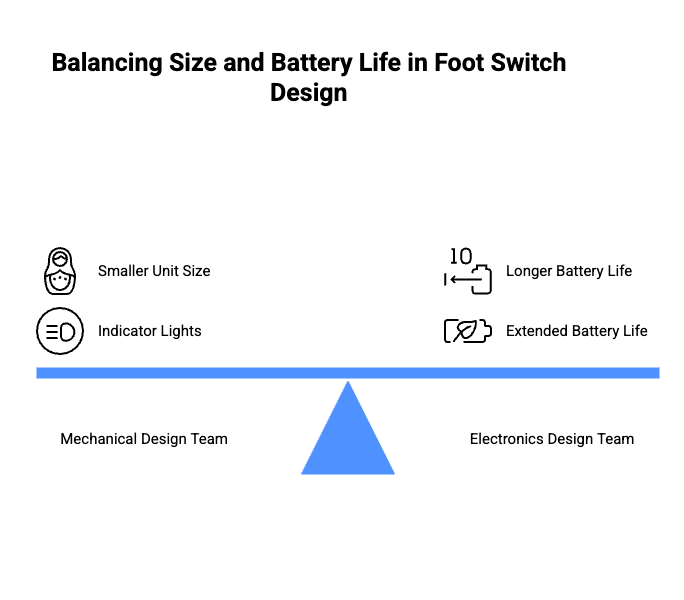 Balancing battery capacity with the overall size of the foot switch is one of the most important design challenges. The mechanical design team often wants the unit to be as small as possible, while the electronics team benefits from a larger battery that offers longer life. Finding the right balance ensures the design meets both performance and ergonomic goals.
